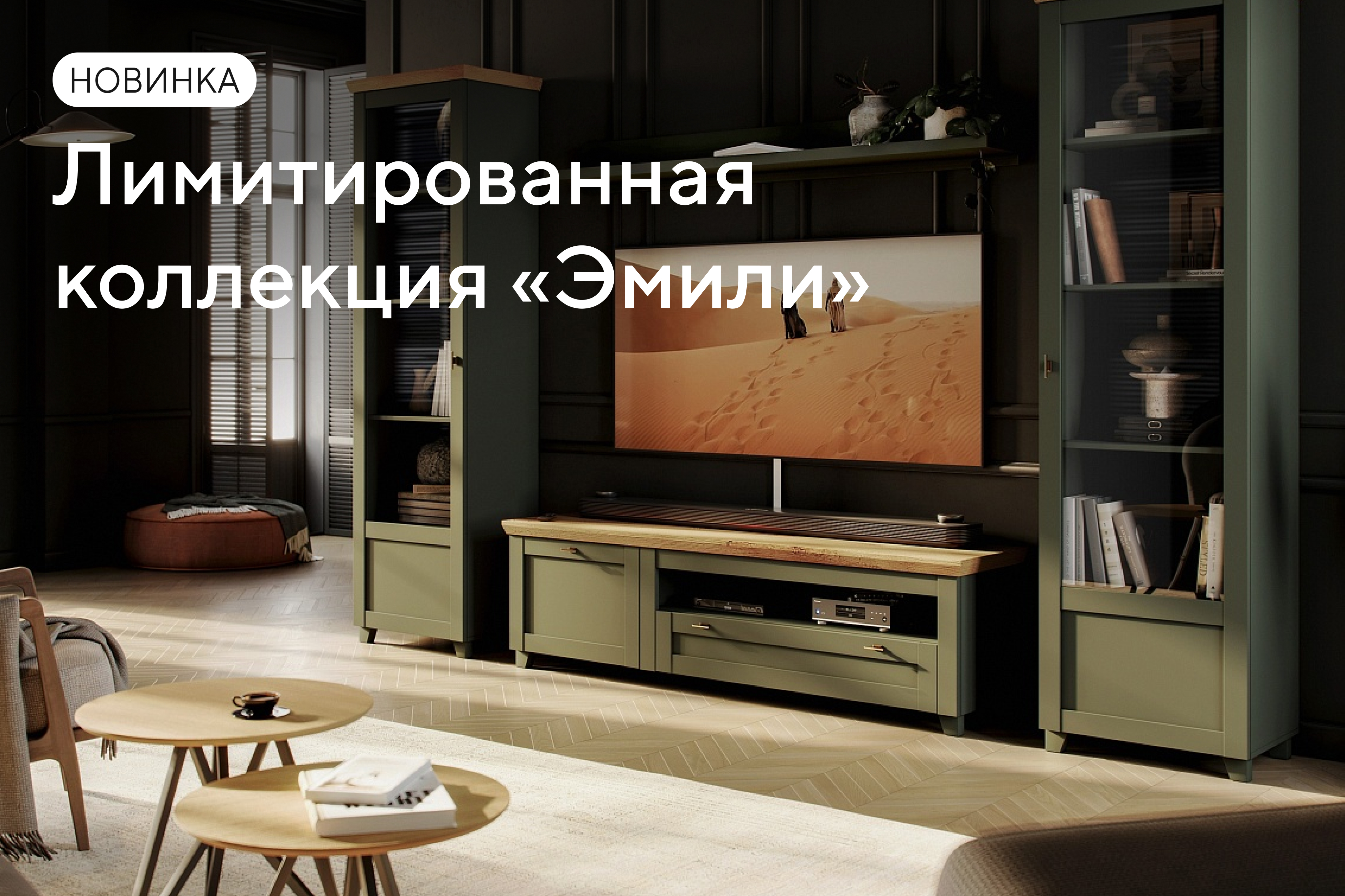 Отличительной чертой коллекции «Эмили» является её тщательно подобранная палитра и текстурные решения. Основные элементы мебели выполнены в глубоком оттенке «олива тёмная», что придаёт композиции выразительность и элегантность.